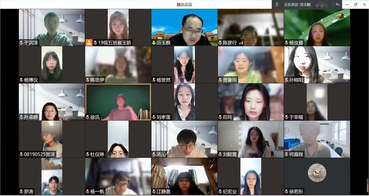 4月8日晚上,2019级五班举办了线上班会,班主任田玉麒老师与五班全体同学进行了亲切交流。首先,田老师关心了同学们寝室生活的基本情况,询问最近饮食保供的变化,崔玉娇等同学积极发言,向老师表达了自己的想法和诉求。田老师表示,希望同学们理解学校政策的变化,积极配合学校安排。随后,田老师与刘孝莲、陈思伊、杨一帆、江静澈等8名同学互动,询问同学们现阶段的学习状况、学业规划和就业规划,为同学们提供了宝贵建议。田老师统计了全班同学的未来规划情况,勉励同学们相互帮助,互相鼓励,完成自己学业目标。最后,田老师认真回答了陈彦行同学提出的问题,并关心了这段时间其他同学的相关进展情况,鼓励同学们利用好未来的时间,充实自己最后的大学本科生活。